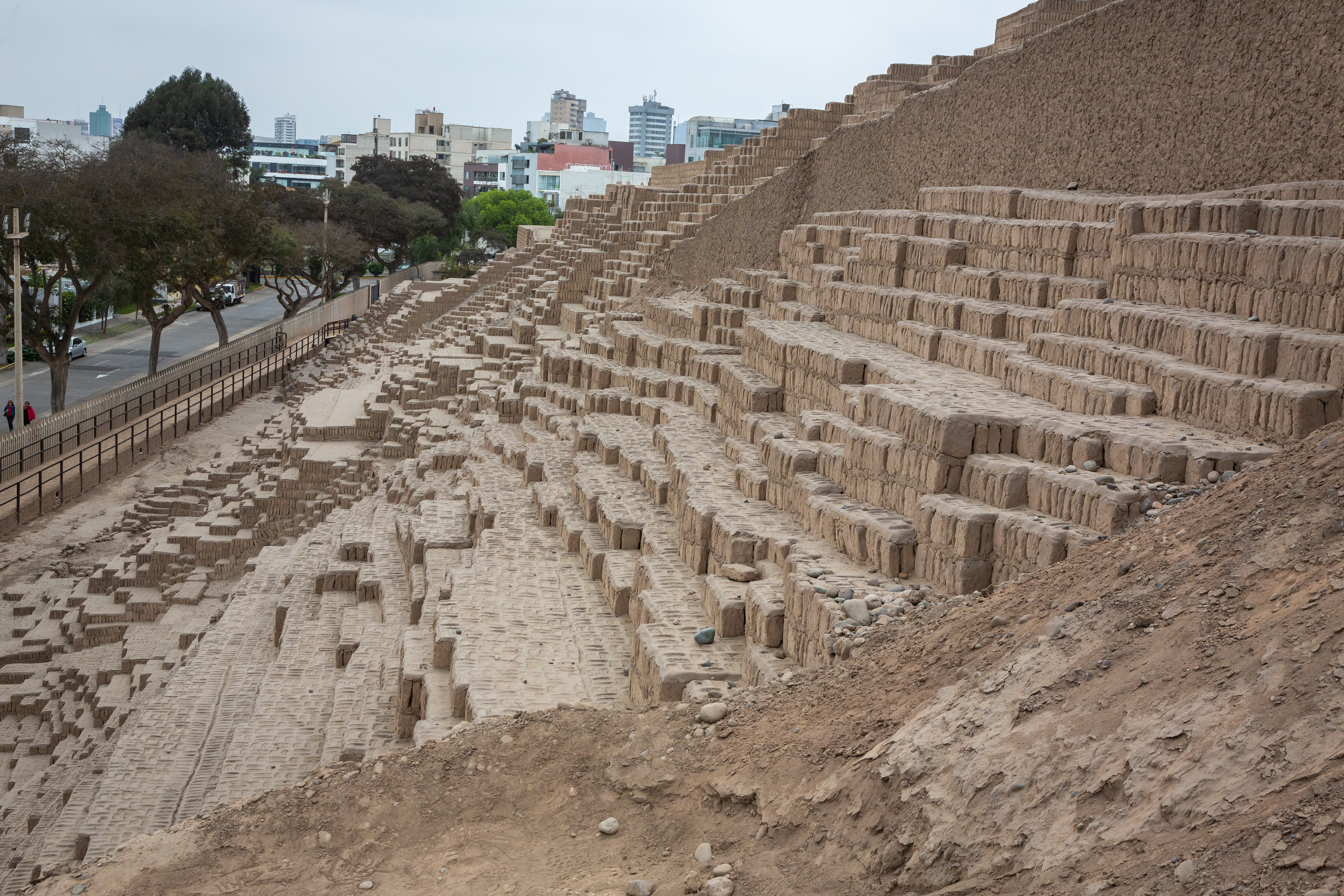 Breakfast the next morning was at the hotel. The official tour returned to the airport with Julia that morning at 4:00 AM but we saw a few stragglers at breakfast. Katia and her dad picked us up and took us to see Huaca Pucllana. This is a pyramid made of adobe bricks and clay. It was first built by the Lima culture between 200 and 450 AD. Subsequent cultures, namely the Wayri and Ychsma built on top of it and expanded it to their own needs. This was a religious and administrative center. The Wayri buried the bodies of their elite within the pyramid. The Ychsma continued to use it under Inca domination until the arrival of the Spanish. It was odd to see this ancient structure coexisting with the modern urban sprawl around it.